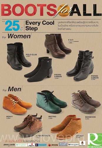 พบกับ รองเท้าบู้ท Boots for all คอลเลคชั่นใหม่ ลดสูงสุด 25% บู้ทหลากดีไซด์จากแบรนด์ดัง อาทิ Polo Club, Pierre Cardin, FOF, Heavy, Matino, Manwood, Hush Puppies, Signor ให้คุณพร้อมสู้อากาศหนาวเย็นเบาๆ ในเมืองไทย หรือจะเอาชนะความหนาวจับใจไกลถึงต่างแดน